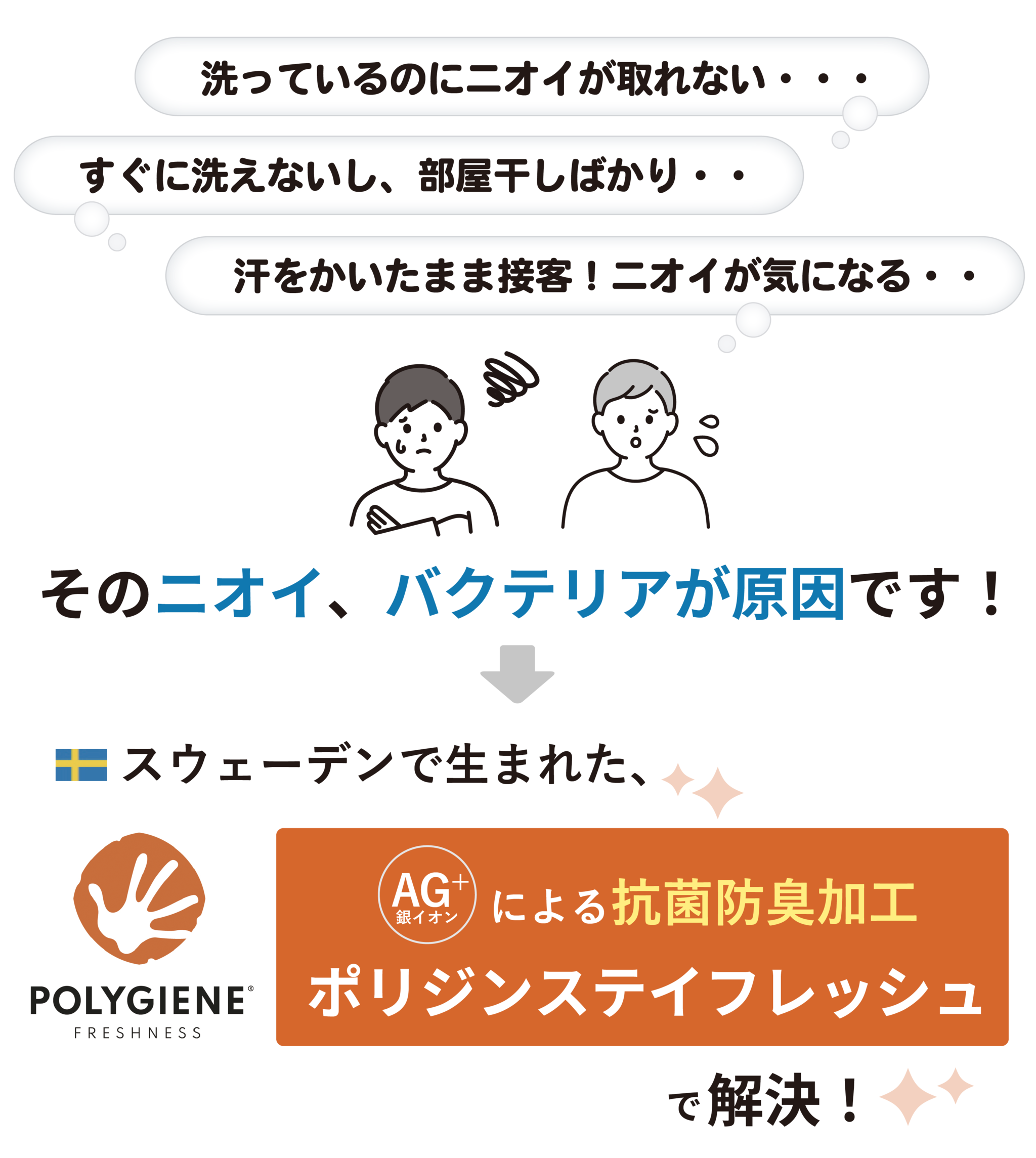 汗は人の体温調節に欠かせない機能。ですが汗をかいて時間が経つほど、繊維上のバクテリアが汗と作用してどんどん増加。これが衣類のいやなニオイの正体です。バクテリアは73℃以上のお湯でなければ除去されず、年々増加してしまいます。
