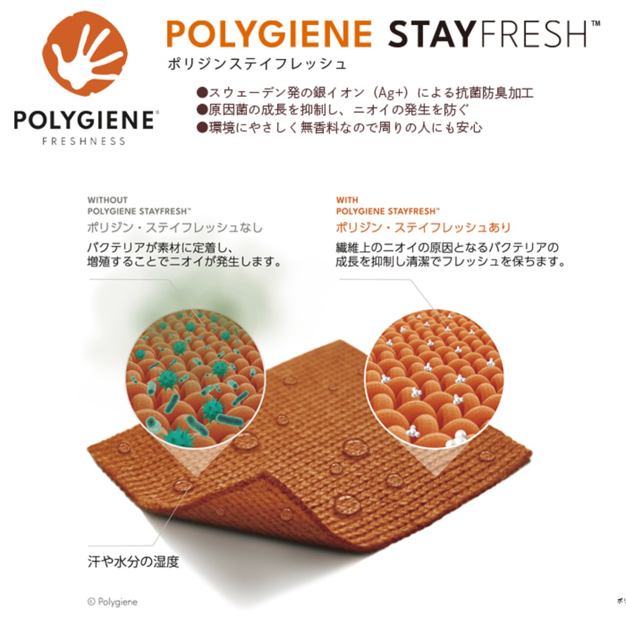 ポリジン社が開発した銀イオン(Ag+)による抗菌防臭加工「ポリジン・ステイフレッシュ」。汗のニオイや部屋干し臭の原因となる菌の成長を抑制し、ニオイの発生を防ぎます。