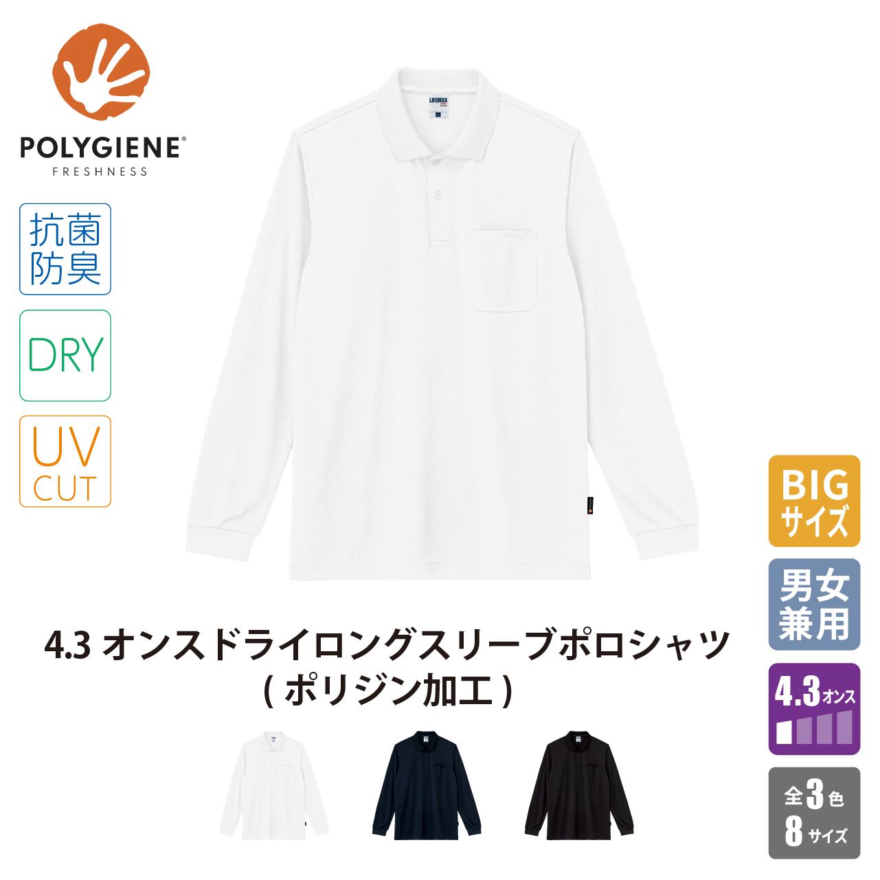 ●吸水・速乾性と汗をニオイにしないポリジン・ステイフレッシュ加工を施した、ベーシックタイプの長袖ポロシャツ。