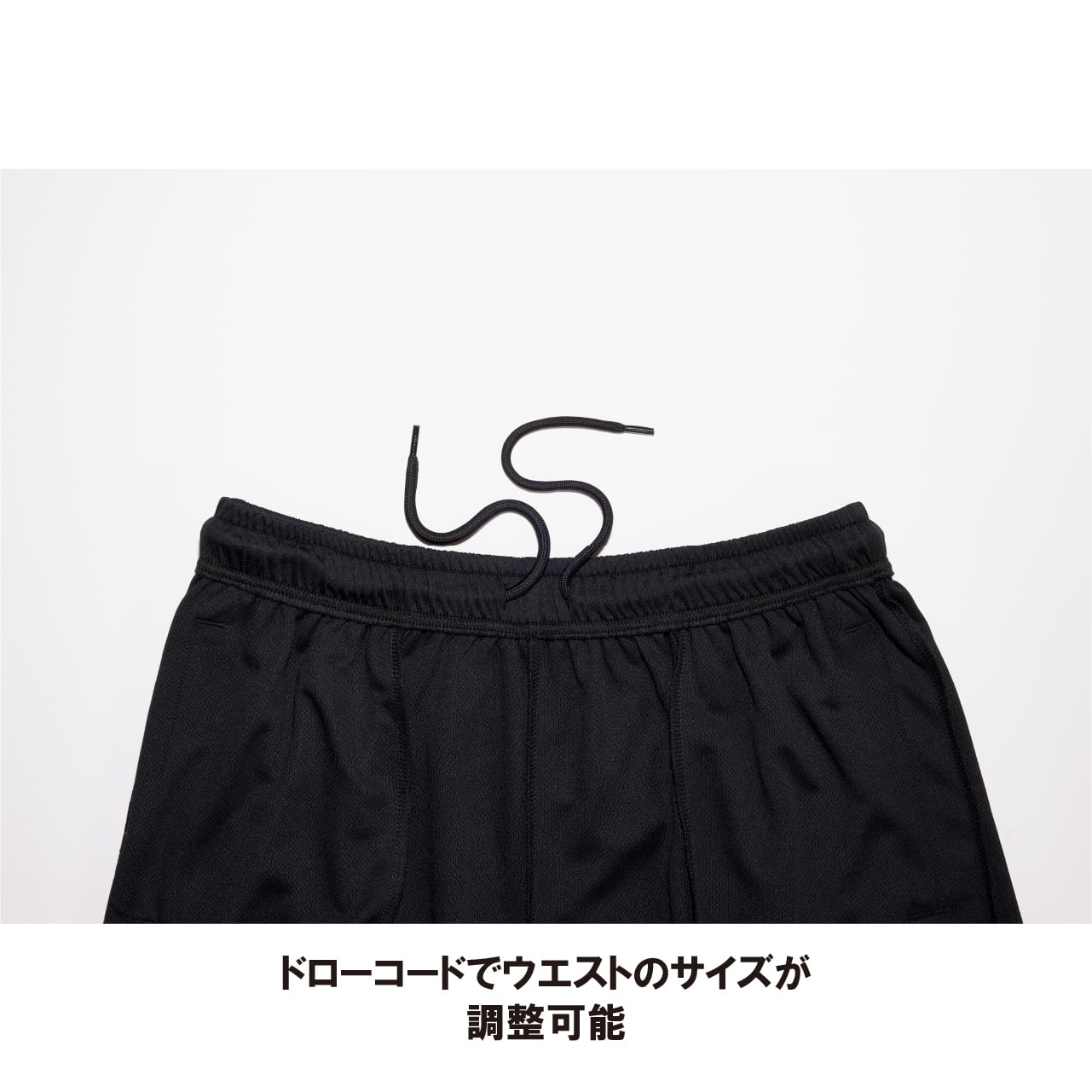 ●両脇ポケットとウエストゴムの快適仕様。ドローコードでウエストサイズの調整も可能。