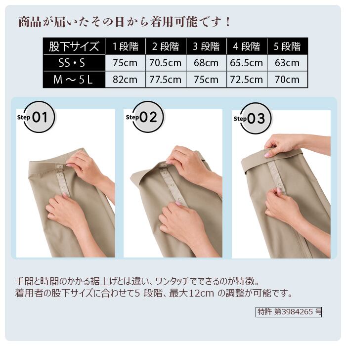 ※手間と時間のかかる裾上げとは違い、ワンタッチでできるのが特徴。