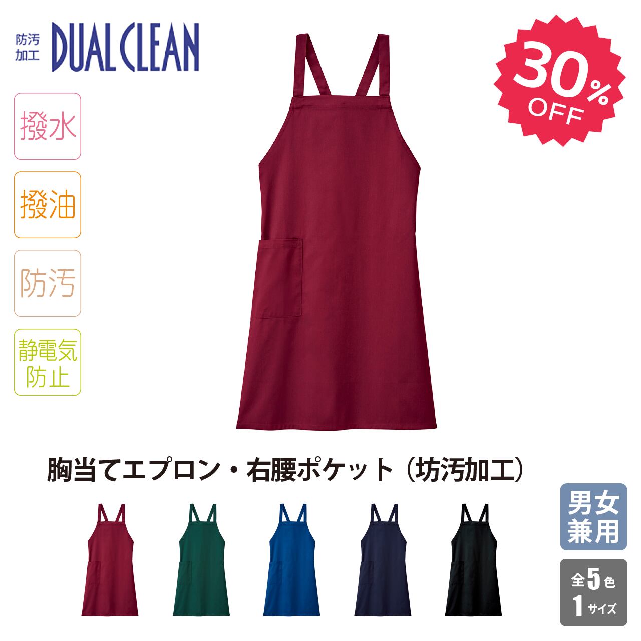 ●汚れにくさ(撥水撥油性)と、汚れの落ち易さ(SR性)を兼ね備えた、坊汚加工デュアルクリーンのロングエプロン。