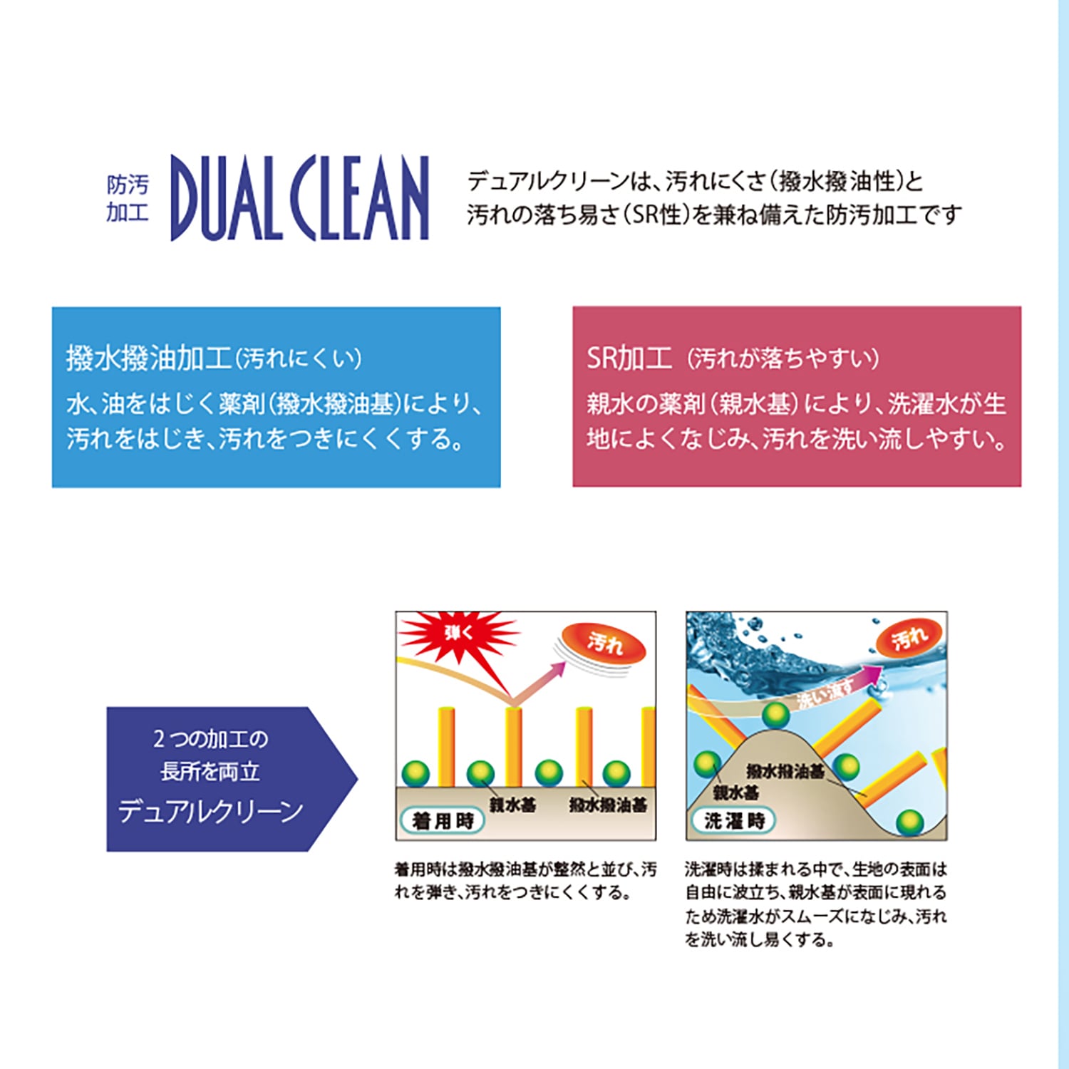 ■坊汚加工デュアルクリーンは、汚れにくさ(撥水撥油性)と、汚れの落ち易さ(SR性)を兼ね備えた坊汚加工です。