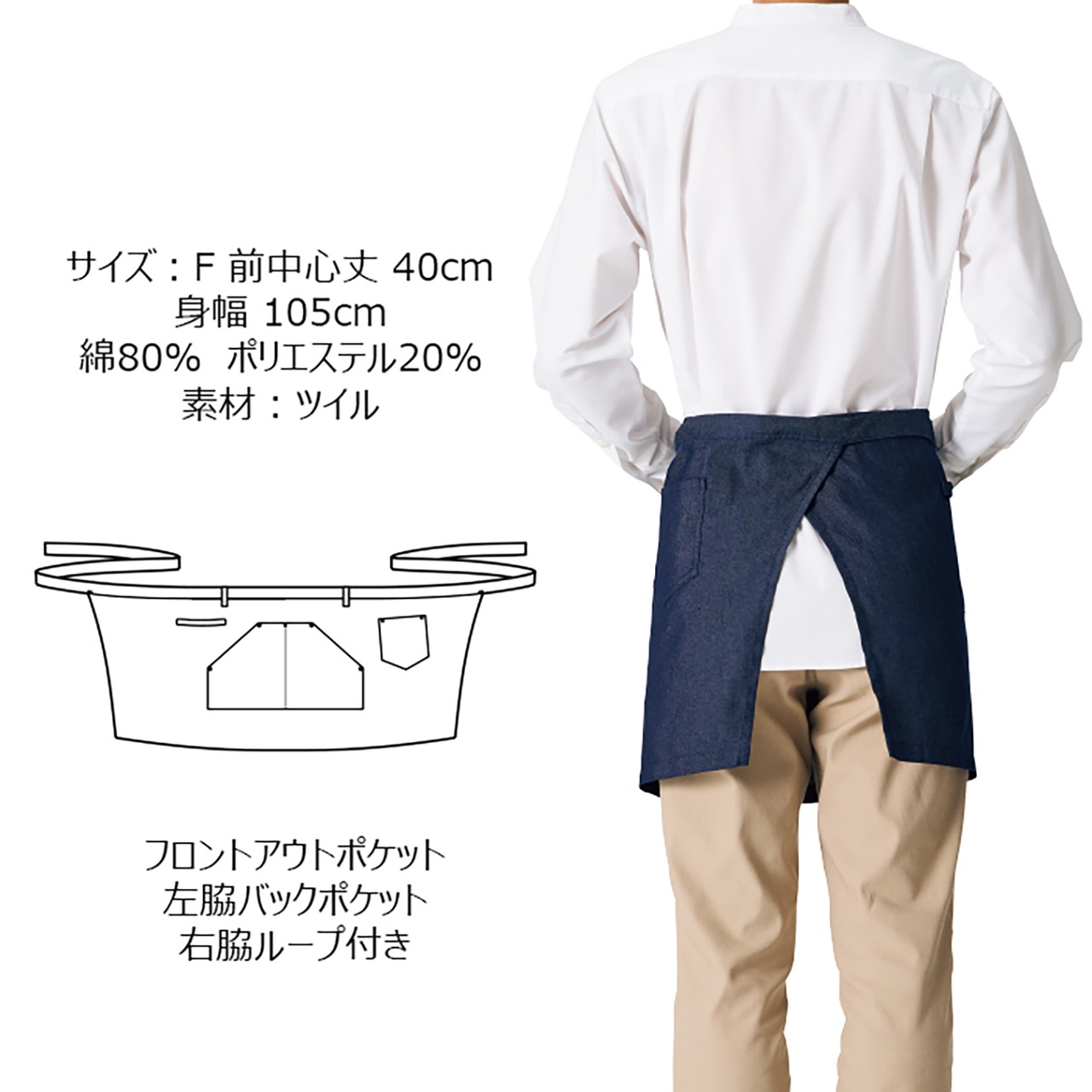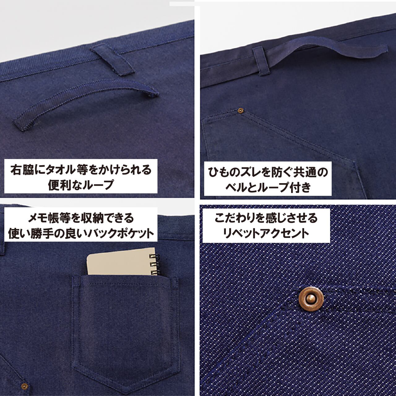 ●ハードに使えるポケット豊富なエプロン。フロントアウトポケット、左脇バックポケット。