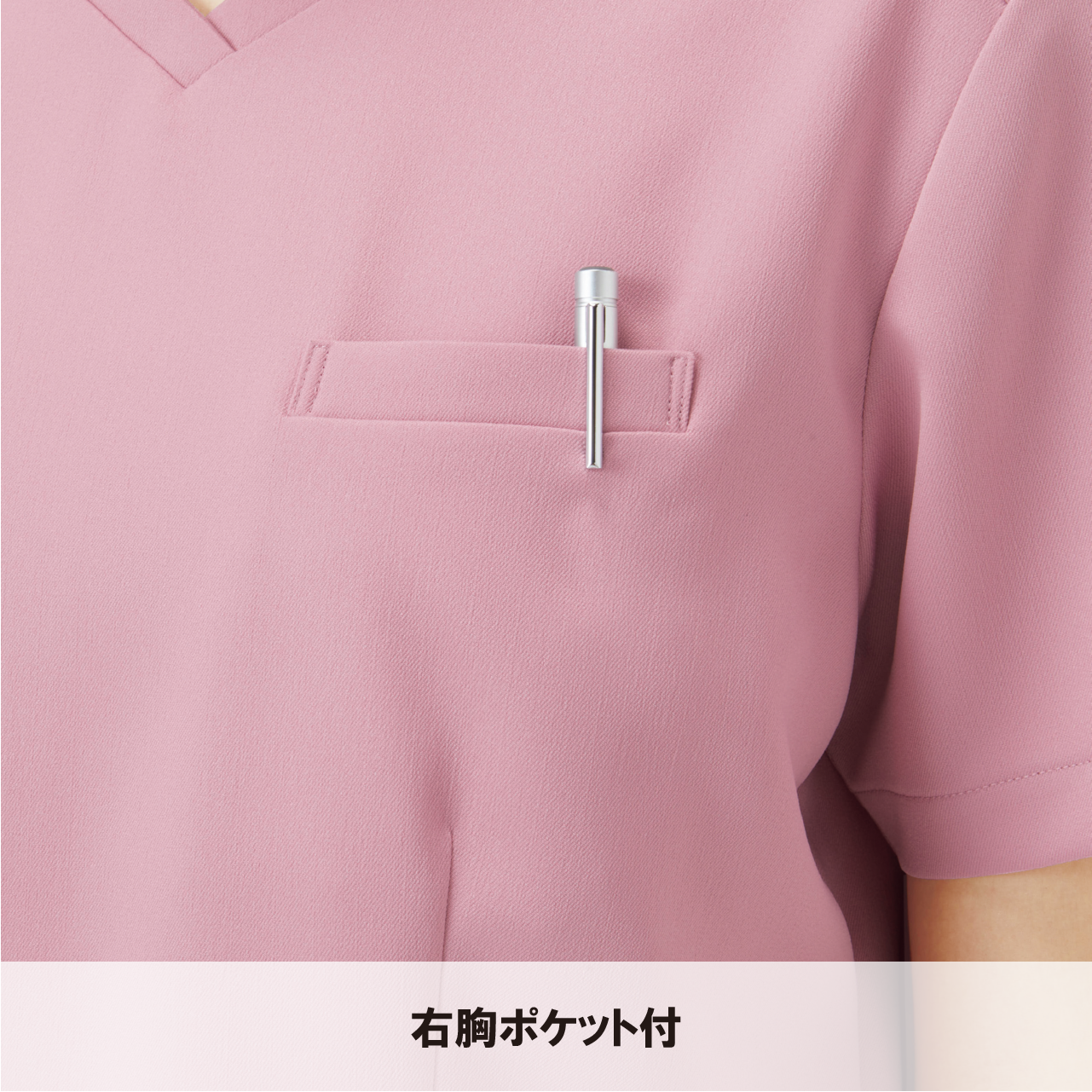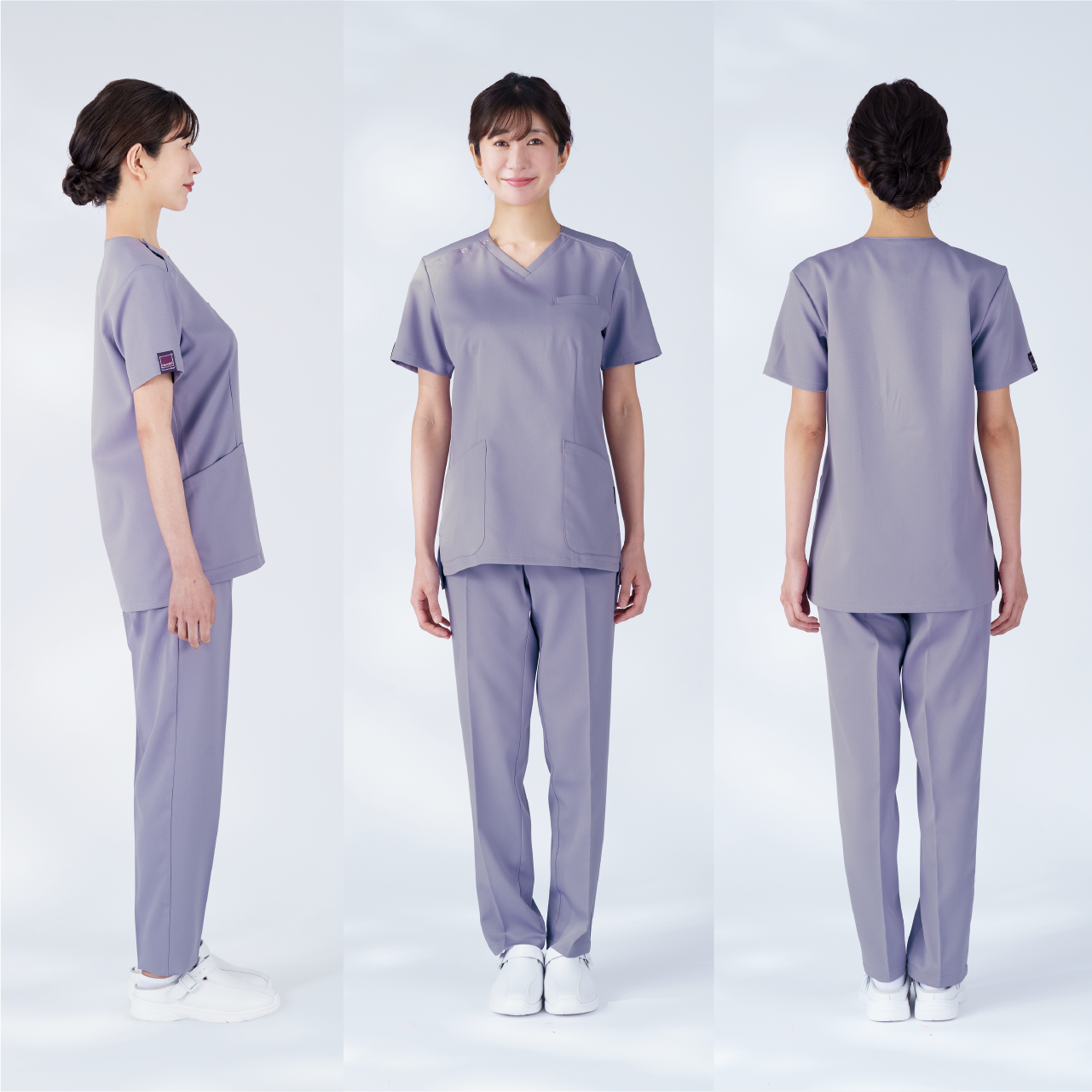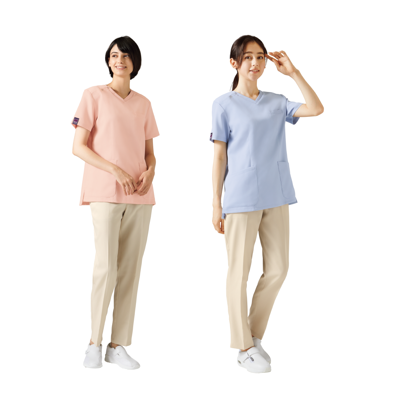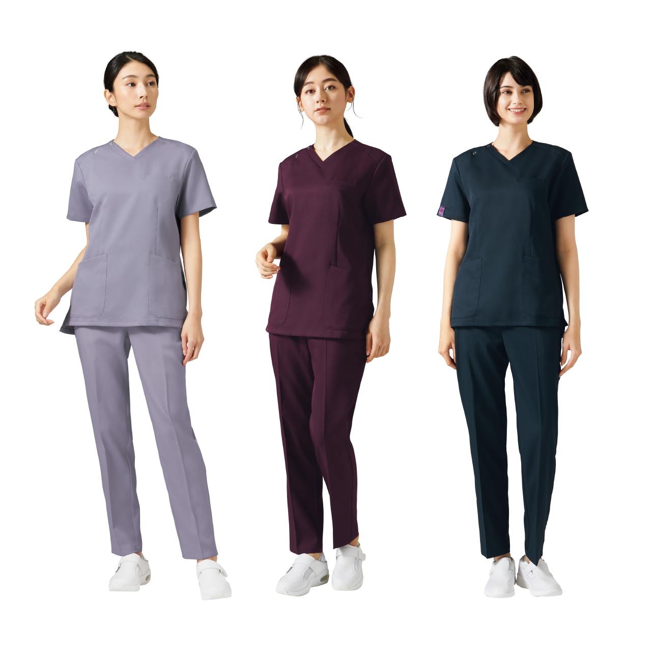 ●女性を美しく魅せる、細すぎず太すぎないシルエット。スクラブの襟ぐりはかがんでも中が見えない浅めのVネック仕様で、顔周りをスッキリ見せる効果もあります。
