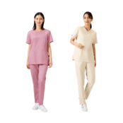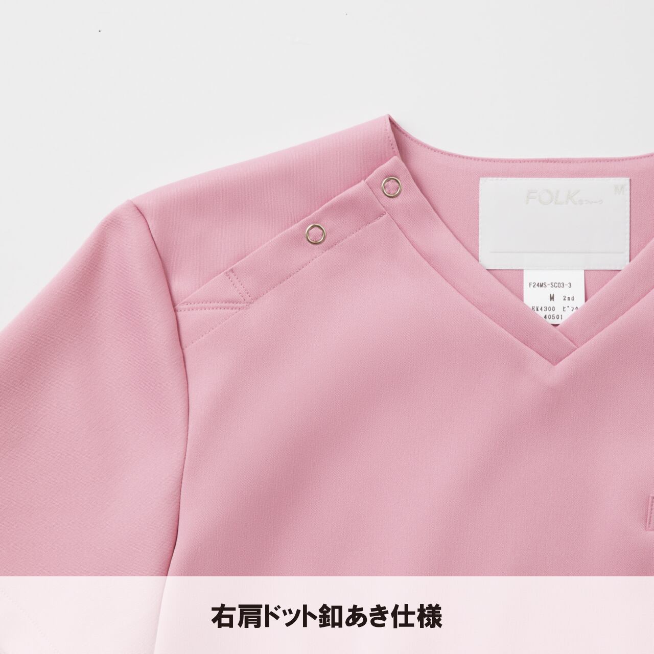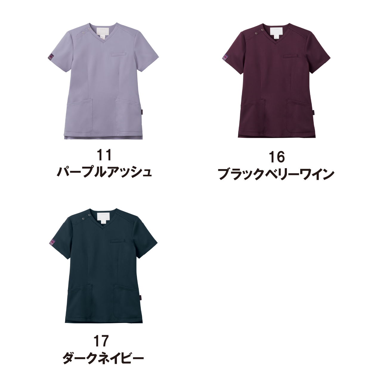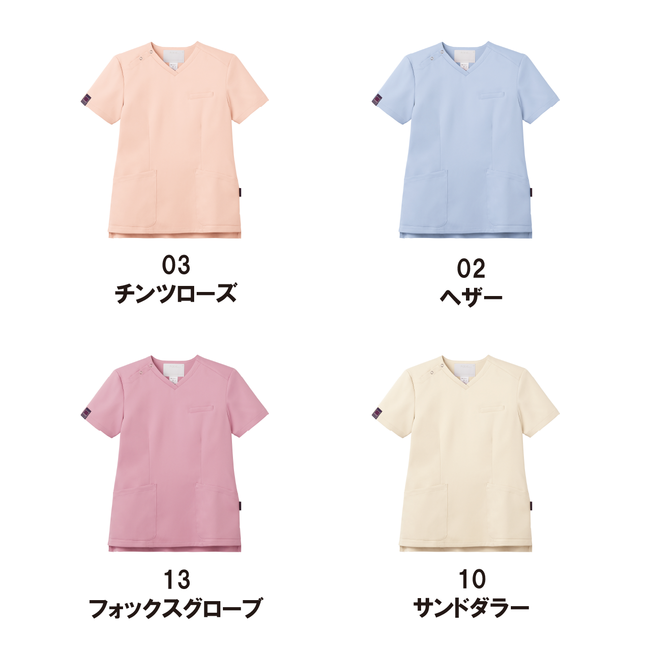 ●女性を美しく魅せる、細すぎず太すぎないシルエット。スクラブの襟ぐりはかがんでも中が見えない浅めのVネック仕様で、顔周りをスッキリ見せる効果もあります。
