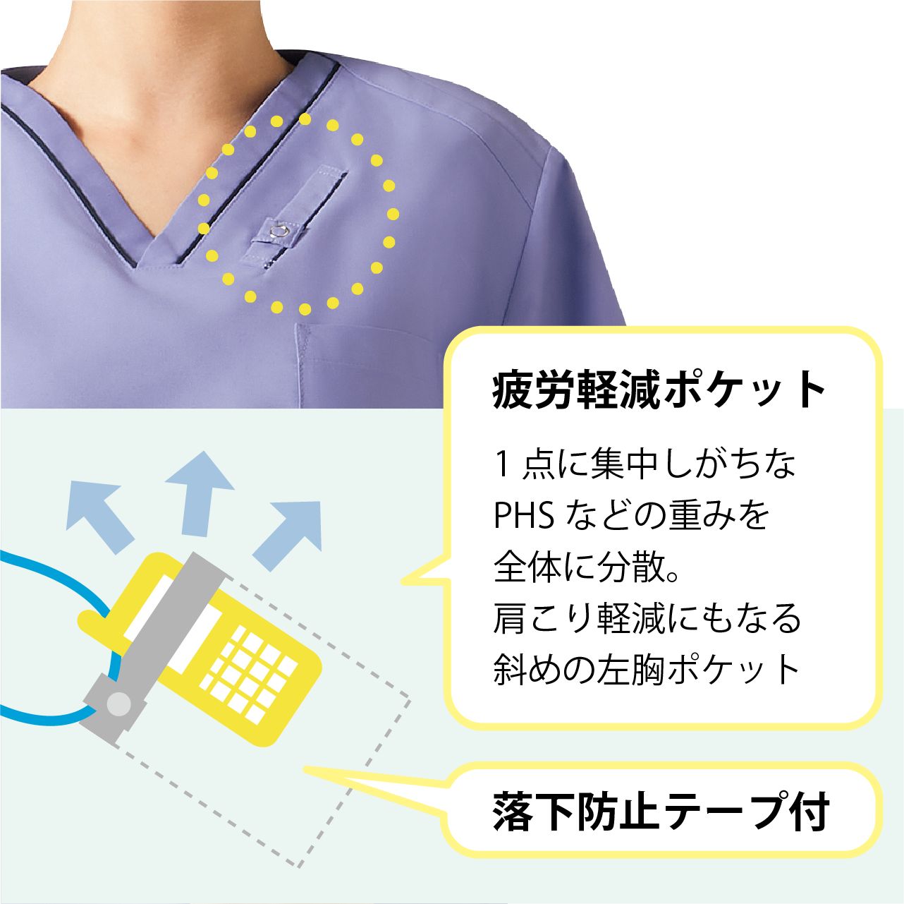 【仕様】左胸ポケット、両腰ポケット、落下防止テープ付胸箱ポケット