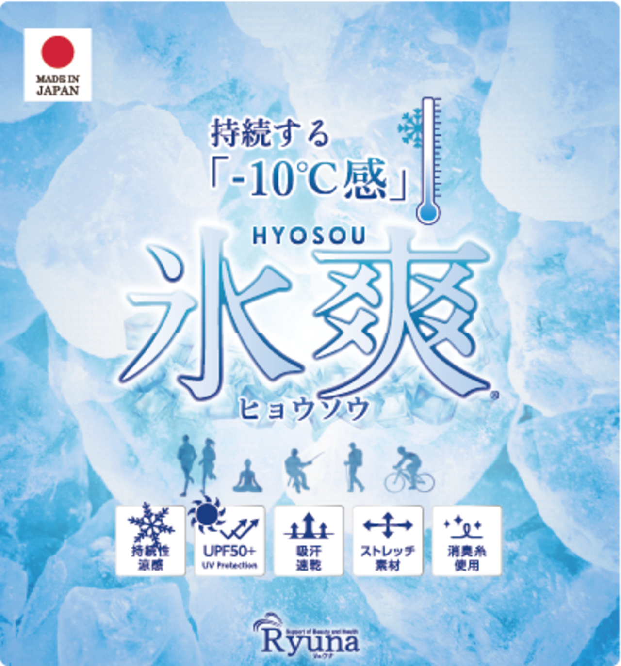●「氷爽」とは、持続性涼感・UPF50+・吸水速乾・消臭糸使用・抜群のストレッチ性など、5つのスペシャルな機能性を持った日本製ブランドです!